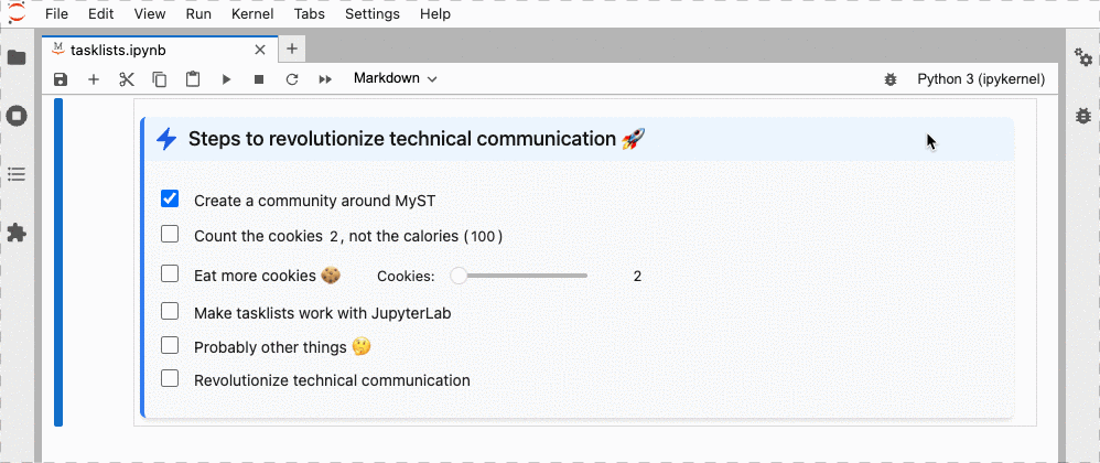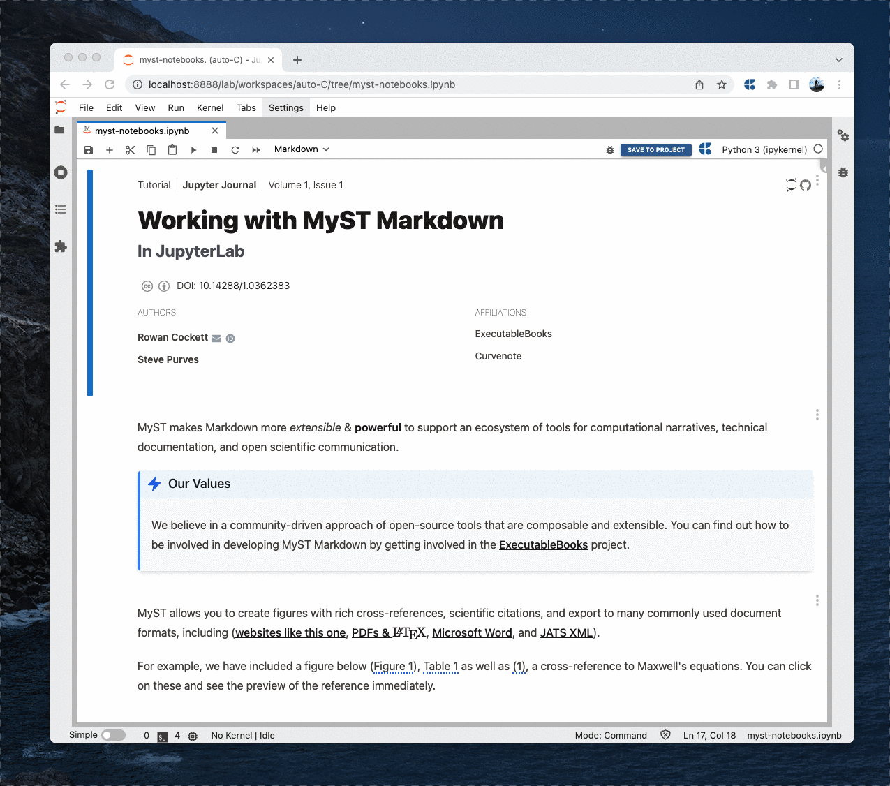 MyST is a flavour of Markdown, which combines the experience of writing Markdown with the programmable extensibility of reStructuredText. This extension for JupyterLab makes it easier to develop rich, computational narratives, technical documentation, and open scientific communication.